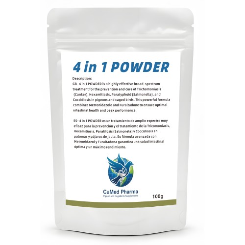 • 4 in 1 POWDER is broad-spectrum treatment by CuMed Pharma, specifically designed for the prevention and treatment of the most common ailments in racing pigeons and cage birds. Its advanced formula combines Metronidazole and Furaltadone to ensure optimal intestinal health and protozoal disinfection, providing maximum performance.