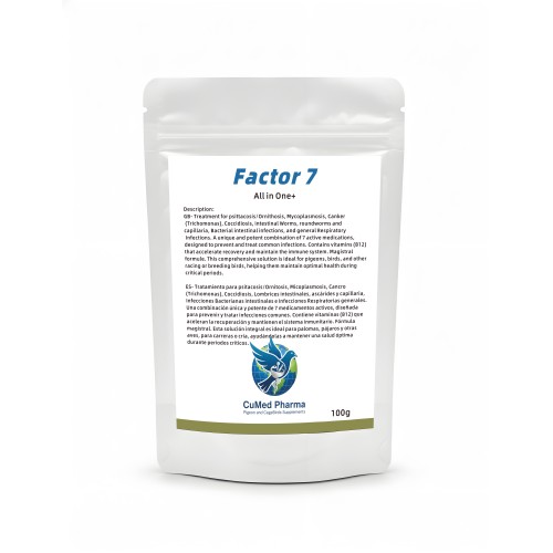 Factor 7 100g - "All in One+" solution from CuMed Pharma. It features a magistral formula combining 7 active medications designed to manage common infections in racing and breeding pigeons. Enriched with Vitamin B12, it aids rapid recovery and bolsters the immune system during the racing season and other critical health periods.