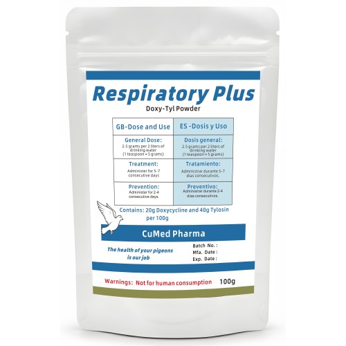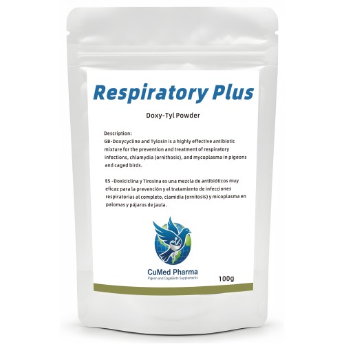 Respiratory Plus 100g from CuMed Pharma. It is a highly effective blend of Tylosin 40% and Doxycycline 20% (Doxy-Tyl) for treating infections of the entire respiratory tract, it is highly effective for the management and prevention of complex respiratory conditions and Ornithosis in racing pigeons and fancy caged birds.