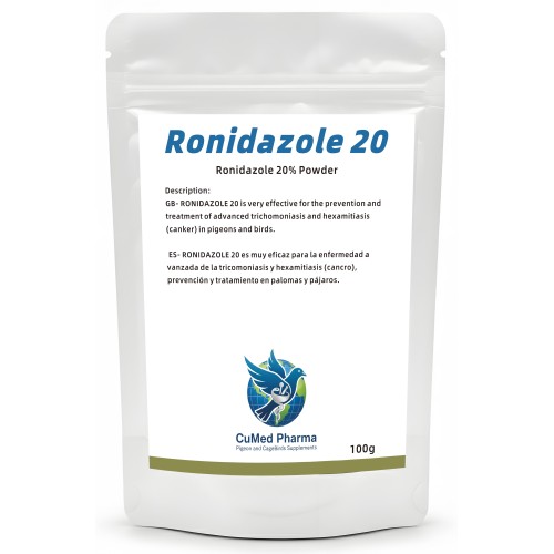 Ronidazole 20 100g from CuMed Pharma, formulated with 20% Ronidazole in a compounded water-soluble powder. This powerful formulation is specifically designed to manage advanced and severe cases of Trichomoniasis and Hexamitiasis (canker) that may be resistant to lower concentrations, ensuring birds are in peak flight and condition during both racing and breeding seasons.
