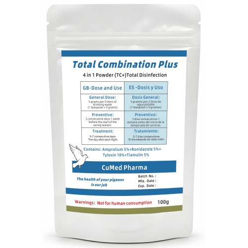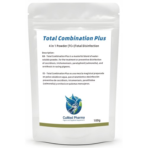 CuMed Pharma - Total Combination Plus (TC+) - 4 in 1 - 100g is a professional-grade compounded water-soluble powder from CuMed Pharma. This product works as a total disinfection system, meticulously formulated to manage and prevent systemic infections, ensuring birds remain in peak physical condition during both the racing and breeding seasons.