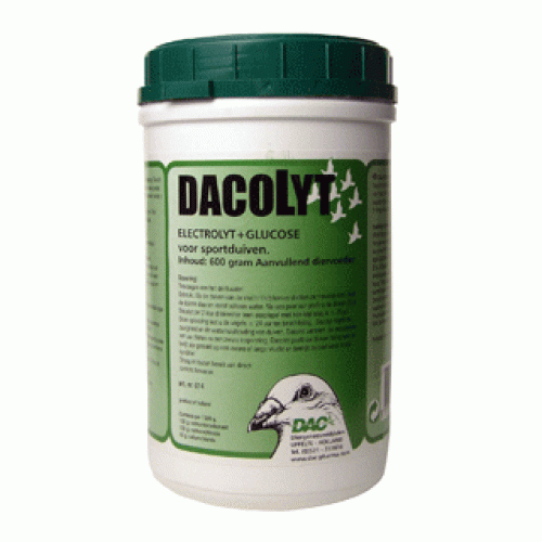 Dacolyt by DAC electrolyte and glucose is a treatment which monitors your birds acid and water balance. Dacolyt accelerates your pigeons recovery time after a long race or flight. It is to be given as instructed in the dosage and feeding instructions to bring your birds back to top condition in a short period of time.